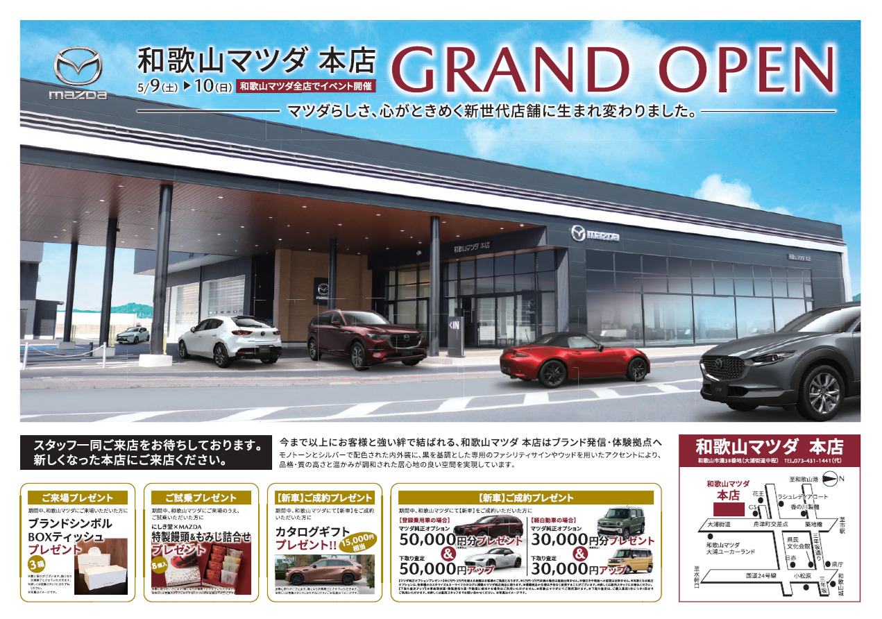 ※和歌山マツダ本店オープン期間は大変込み合うことが予想されます。暫くの間、弊社紀三井寺店もしくは那賀店をご利用いただけますと幸いです。